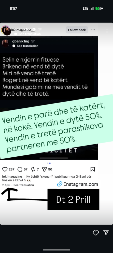 Për të mbështetur pretendimet e tij, G-Bani ka rishpërndarë një screenshot të një statusi të publikuar që në datën 2 Prill nga Loki Magazine, shumë kohë para finales.