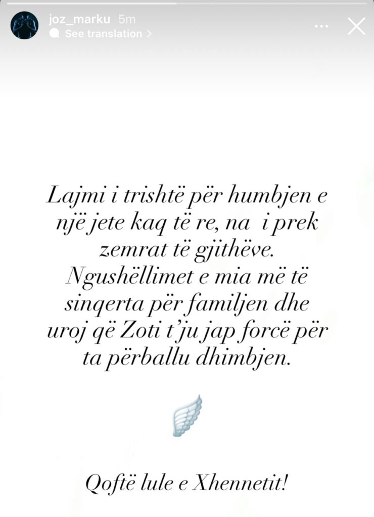 “Lajmi i trishtë për humbjen e një jete kaq të re, na i prek zemrat të gjithëve. Ngushëllimet e mia më të sinqerta për familjen dhe uroj që Zoti t’ju jap forcë për ta përballu dhimbjen. Qoftë lule e Xhennetit!”- shkroi ai në Instastory.