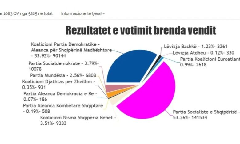 Ndërsa janë numëruar deri në orën 06:00 1083 kuti nga 5225 në total, Partia Socialiste kryeson bindshëm me 53.26% të votave të grumbulluara