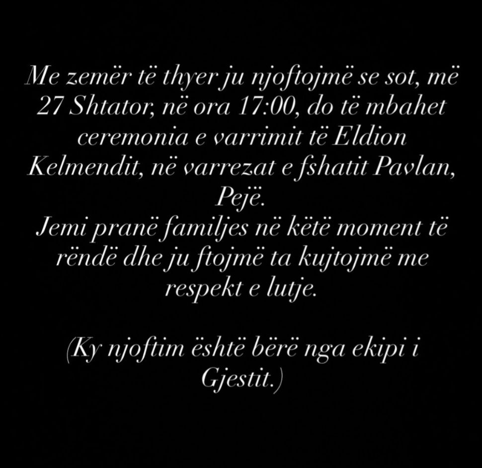 “Me zemër të thyer ju njoftojmë se sot, më 27 Shtator, në ora 17:00, do të mbahet ceremonia e varrimit te Eldion Kelmendit, në varrezat e fshatit Pavlan. Jemi pranë familjes në këtë moment të rënde dhe ju ftojmë ta kujtojmë me respekt e lutje,” thuhet në njoftim.