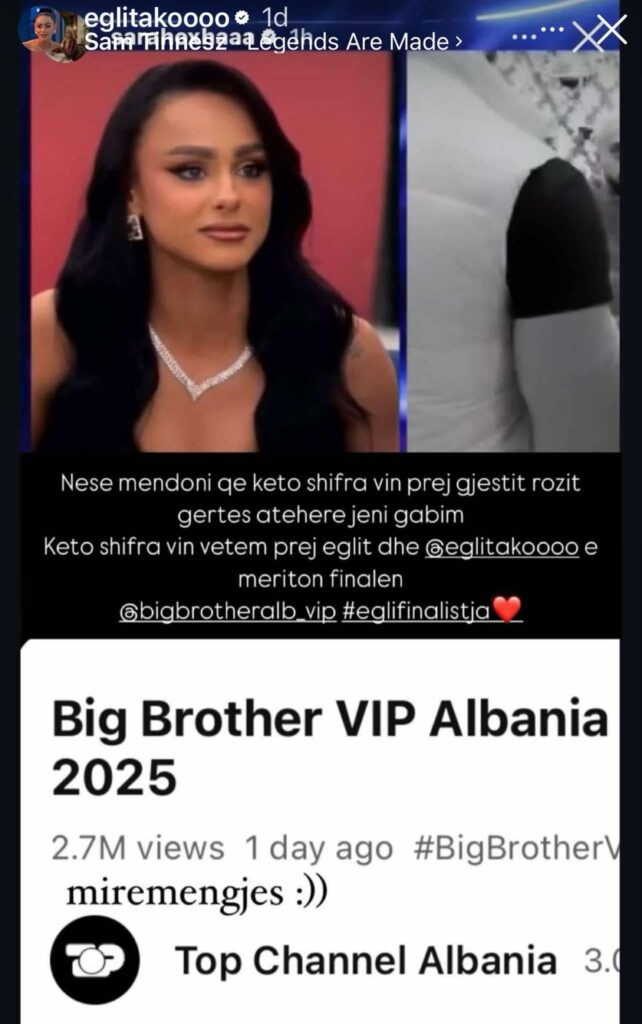 “Nëse mendoni që këto shifra vijnë prej Gjestit, Rozit, Gertës atëherë jeni gabim. Këto shifra vijnë vetëm prej Eglit dhe Egli Tako meriton finalen”, thuhet mes tjerash në këtë reagim.