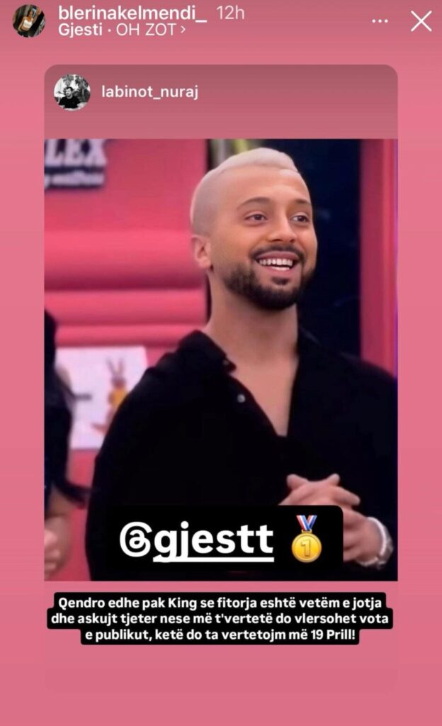 “Qëndro edhe pak King se fitorja është vetëm e jotrja dhe askujt tjetër nëse me t’vërtetë do vlerësohet vota e publikut, këtë do ta vërtetojmë, më 19 prill”, ka shkruar Blerina krahas kësajj fotografie të shpërndarë në llogarinë e saj në Instagram, transmeton IndeksOnline.