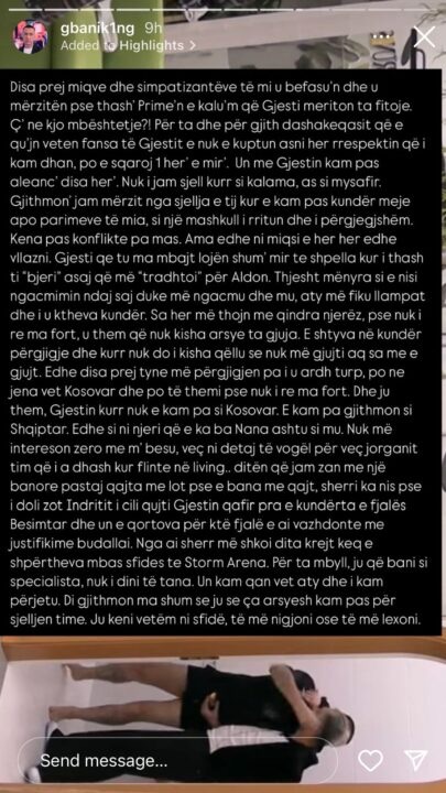 Nuk më intereson zero me më besuar, veç një detaj të vogël për veç jorganit tim që ia dhashë kur flinte në living… ditën që jam zënë me një banore pastaj kam qarë me lot pse e bëra me qarë, sherri ka nis pse i doli zot Indritit i cili quajti Gjestin qafir, pra e kundërta e fjalës besimtar dhe unë e qortova për këtë fjalë e ai vazhdonte me justifikime budallai. Nga ai sherr më shkoi dita krejt keq e shpërtheva mbas sfidvs te Storm Arena. Për ta mbyll, ju që bëni si specialistë, nuk i dini të gjitha. Unë kam qenë vetë aty dhe i kam përjetuar. Di gjithmonë më shumë se ju se ça arsyesh kam pasur për sjelljen time. Ju keni vetëm një sfidë, të më dëgjoni ose të më lexoni”, shkruan ish-banori në postimin e tij të gjatë në “Instastory”.