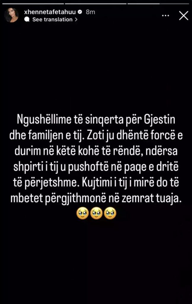 Xheneta Fetahu, ish banorja e Big Brother Vip Kosova 4 që pati një lidhje me Gjestin brenda shtëpisë, ka reaguar përmes një postimi në rrjetet sociale, ku i ka dërguar fjalë ngushëllimi Gjestit dhe familjes së tij në këtë moment të rëndë.